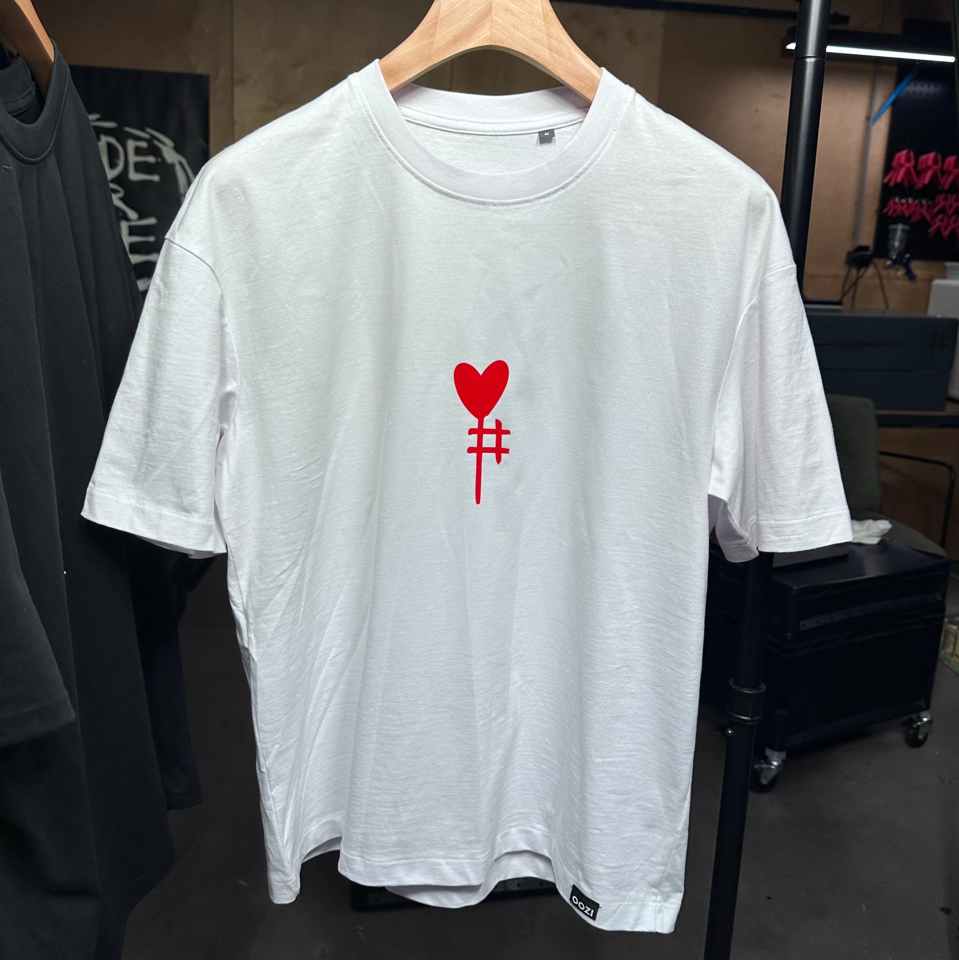 Biele tričko s červeným symbolom srdca a oozitag. Jednoduchý odkaz, silný význam. "WE NEED LOVE" nie je len výkrik do tmy – je to pripomienka v čase, keď ticho býva hlučnejšie než slová.